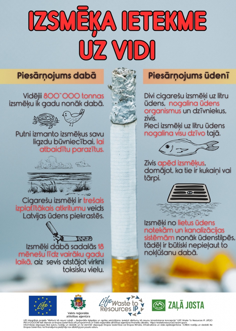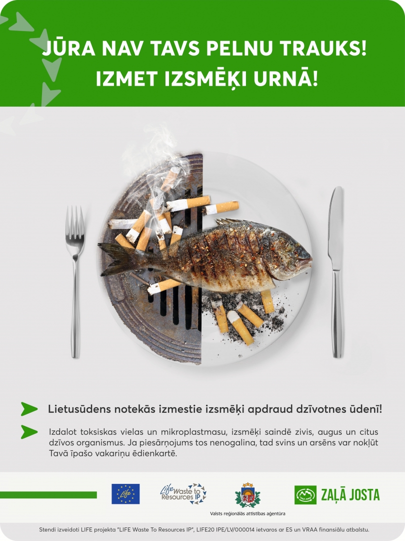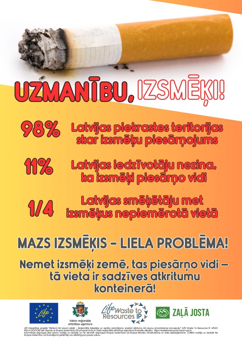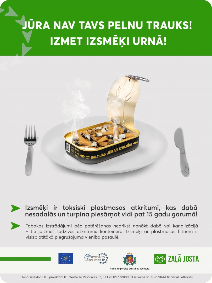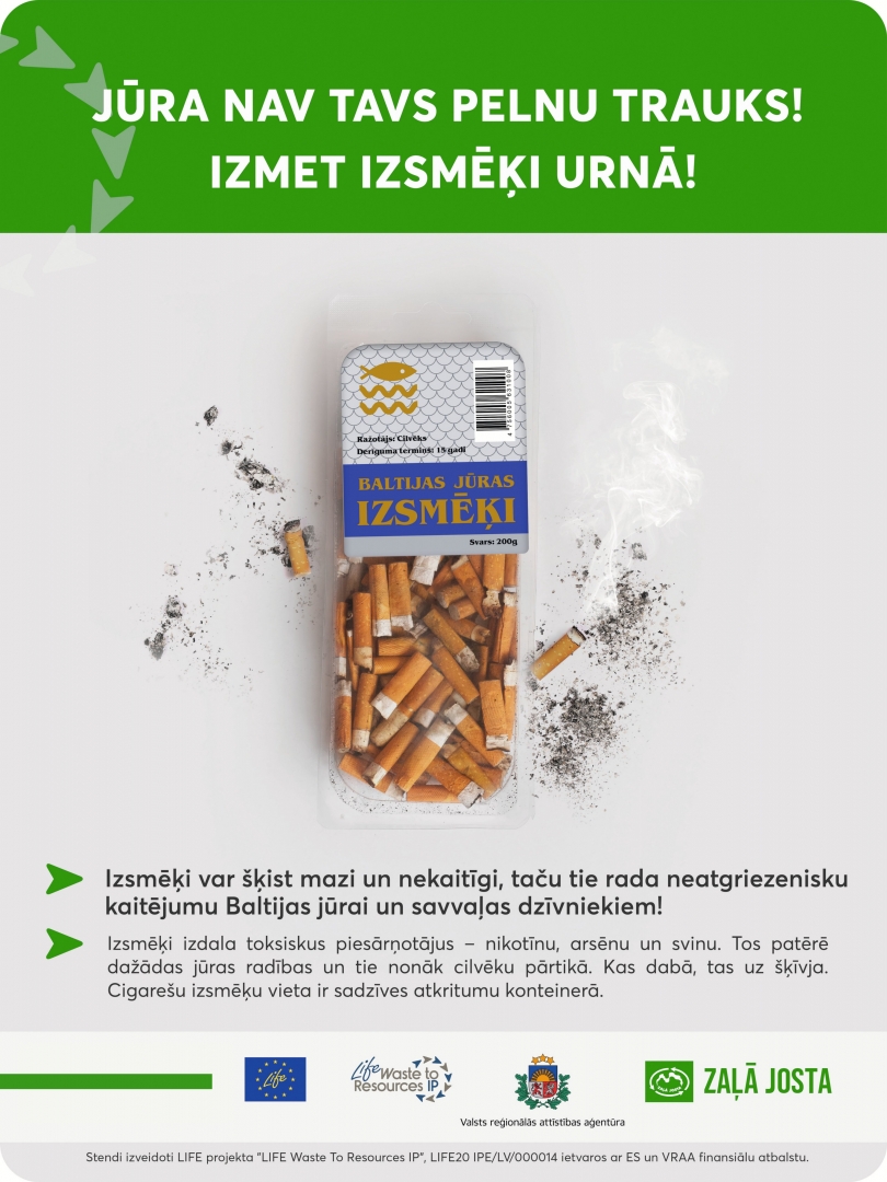 Šī gada piekrastes monitoringa dati liecina, ka izsmēki ir izplatītākā piesārņojošā atkritumu vienība Latvijā. Lai veicinātu sabiedrības izpratni un iedzīvotāju uzvedības maiņu attiecībā uz izsmēķu pareizu izmešanu, projekta partneris SIA “Zaļā josta” ir izstrādājis informatīvus un izglītojošus plakātus un īsfilmu “Izsmēka ceļš”.