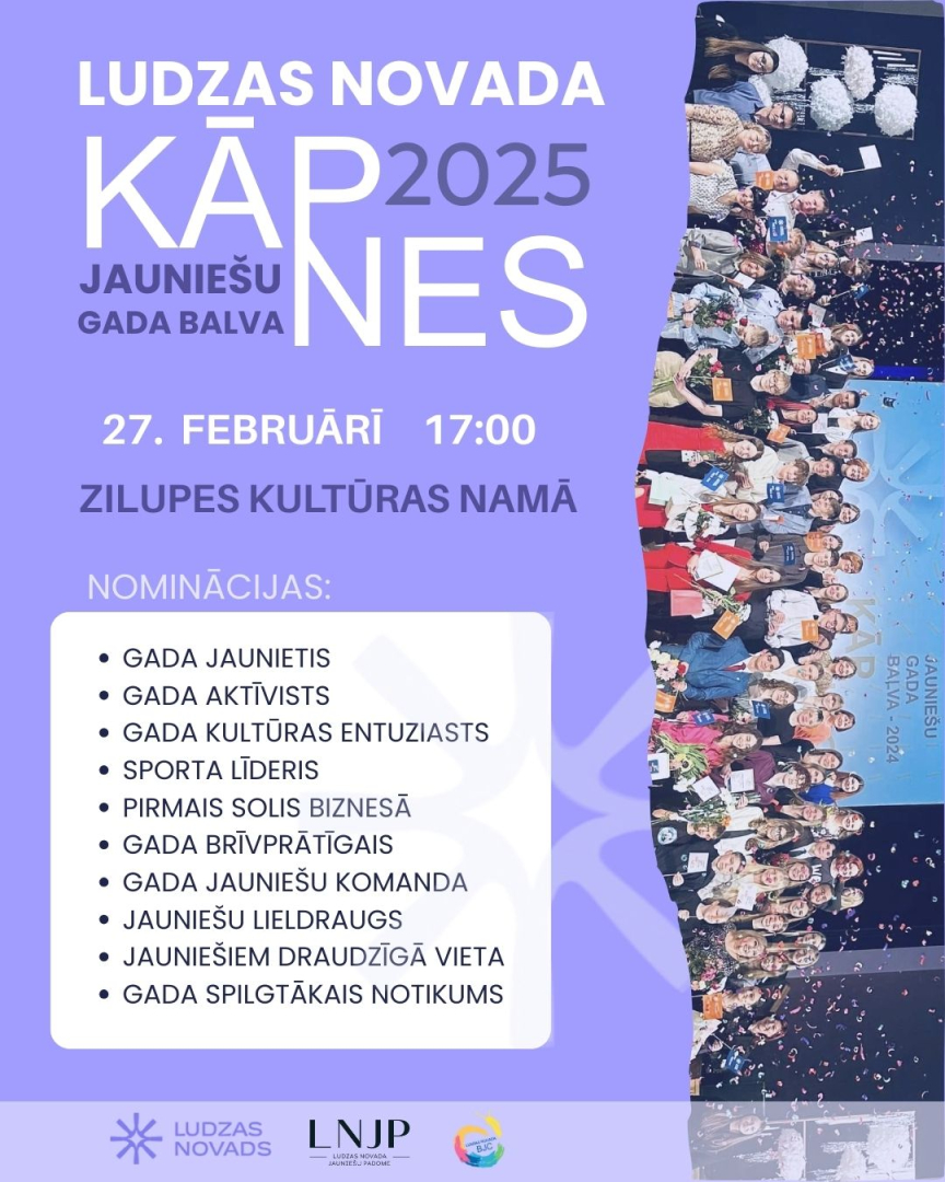 Konkursa "Ludzas novada Jauniešu gada balva 2025 KĀP-NES!" noslēguma pasākums jau pavisam drīz – 27. februārī plkst. 17.00 Zilupes Kultūras namā. Sanāksim kopā, lai atbalstītu jauniešus, iedvesmojošas idejas un radošās iniciatīvas, kā arī cilvēkus, kuri radīja, darīja, pilnveidoja un attīstīja jaunatnes dzīvi mūsu novadā!