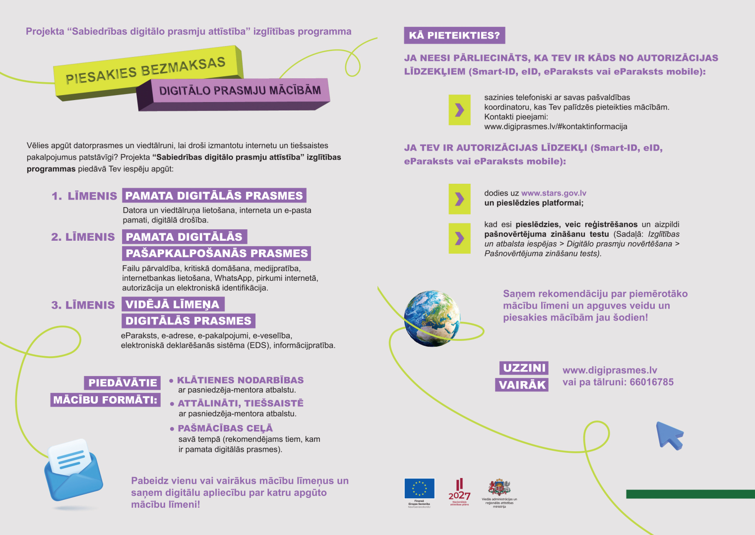 Pieteikšanās mācībām notiek patstāvīgi platformā https://www.digiprasmes.lv/#ka-pieteikties. Tāpat interesenti var sazināties ar projekta koordinatori Ludzas novadā Sarmīti Leščinsku pa tālruni +371 26439768, lai vienotos par pieteikšanos mācībām projektā klātienē.