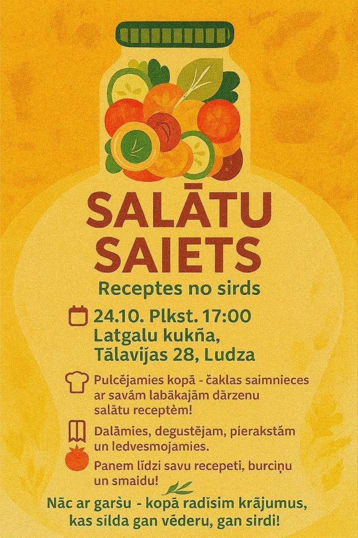 Salātu saietā aicinām uz īpašu kopā sanākšanu, kur galvenajā lomā – dārzeņu un augļu salāti mūsu ikdienai. Katra saimniece dalīsies ar savu pārbaudītu, gardu salātu recepti. Kopīgi gatavosim, mācīsimies, degustēsim un pierakstīsim receptes. Nāc ar savu recepti, dārzeņiem vai ziemas salātu burciņu un smaidu – kopā radīsim vitamīnu bumbas mūsu veselībai, lai veseli un stipri sagaidām ziemu!