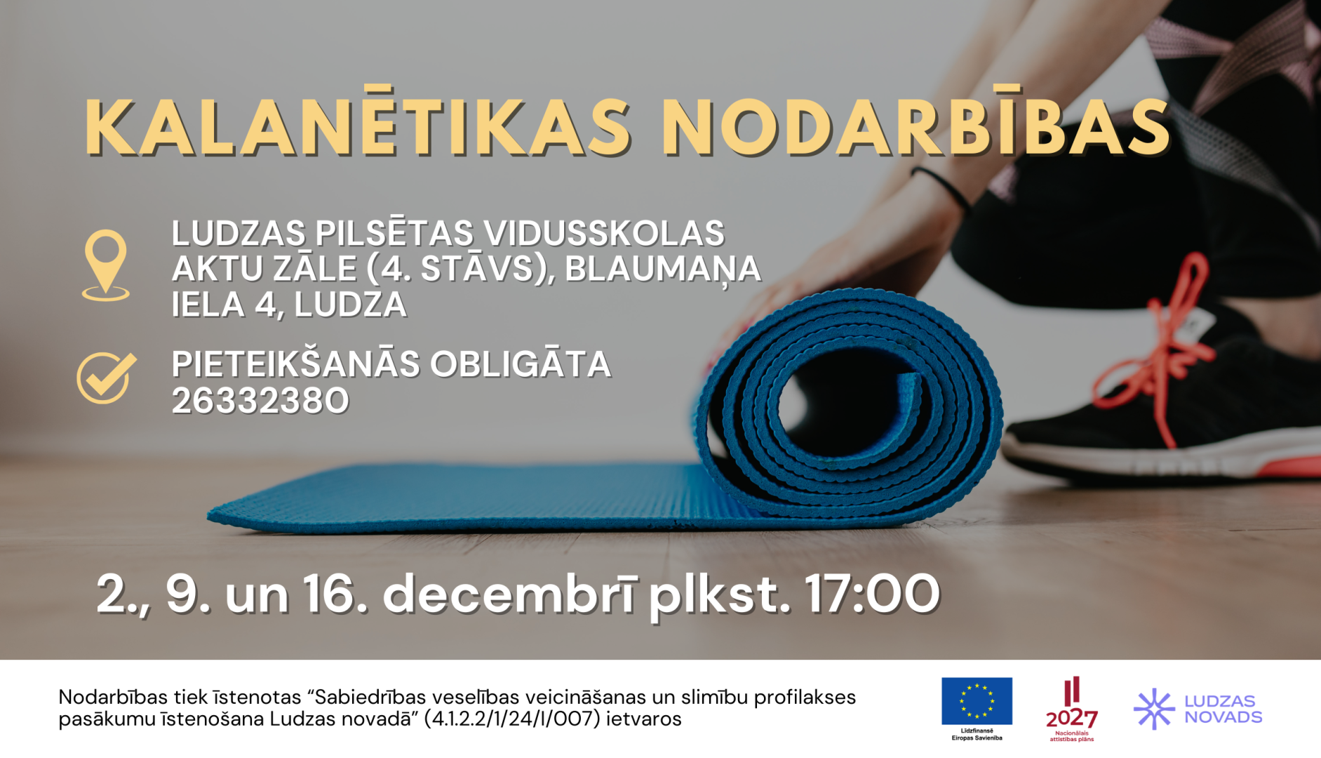 Ludzas novada pašvaldība decembrī turpina piedāvāt ikvienam novada iedzīvotājam iespēju stiprināt veselību un vairot ikdienas labsajūtu. Aicinām piedalīties dažādās bezmaksas nodarbībās un aktivitātēs, kas palīdzēs saglabāt enerģiju un možu garu arī gada noslēdzošajā mēnesī. Nāc, piedalies un piepildi decembri ar kustību, līdzsvaru un labu pašsajūtu!