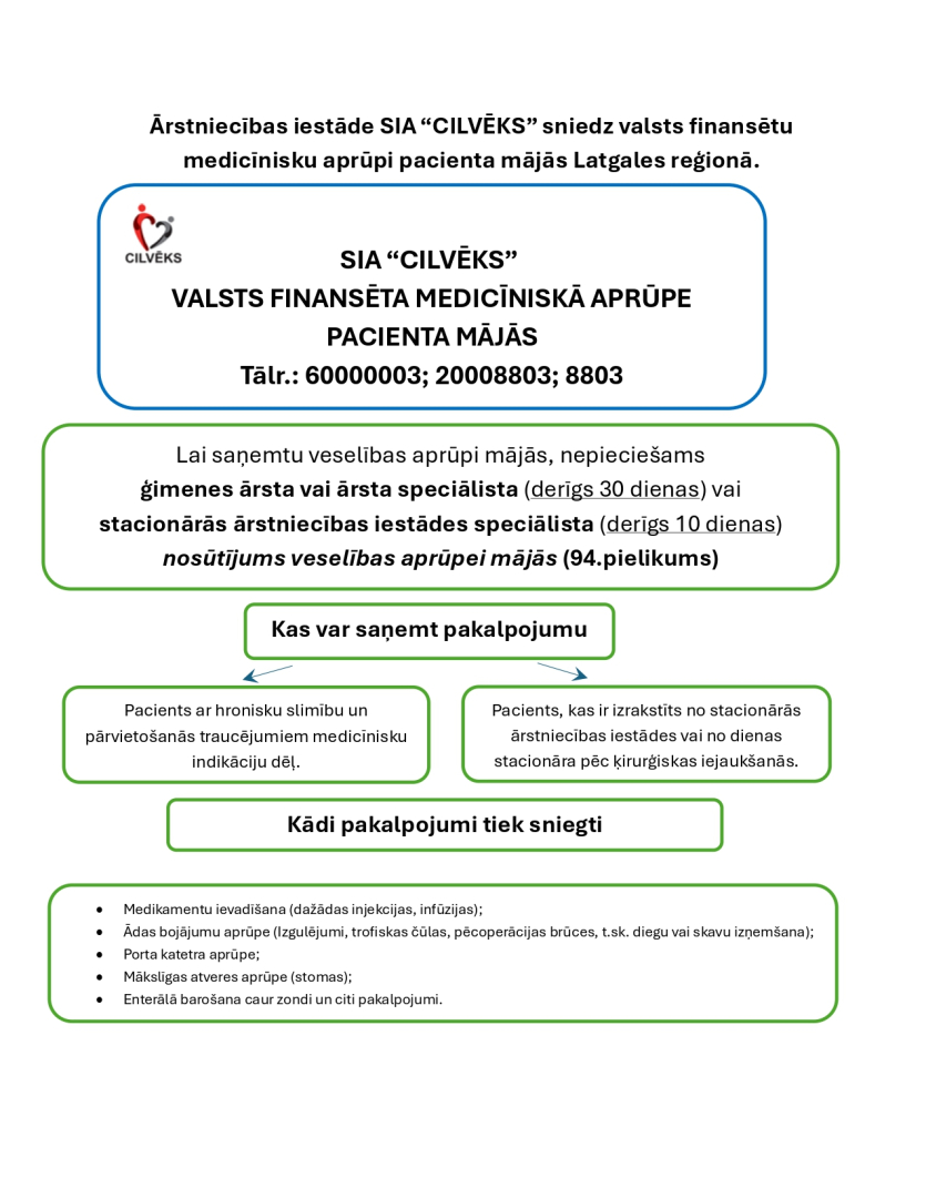 Lai saņemtu veselības aprūpi mājās, nepieciešams ģimenes ārsta vai ārsta speciālista (derīgs 30 dienas) vai stacionārās ārstniecības iestādes speciālista (derīgs 10 dienas nosūtījums veselības aprūpei mājās (94.pielikums).