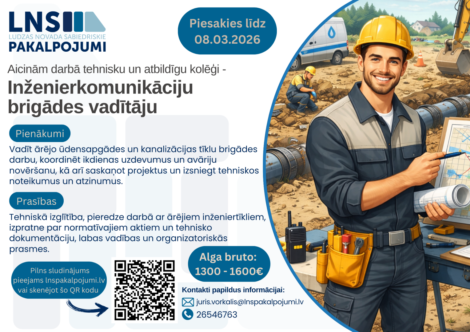 Daudznozaru uzņēmums SIA "LNS pakalpojumi” ar 20 gadu pieredzi ūdenssaimniecības, siltumapgādes, atkritumu apsaimniekošanas, dzīvojamo māju pārvaldīšanas un citās jomās, aicina darbā inženierkomunikāciju brigādes vadītāju.