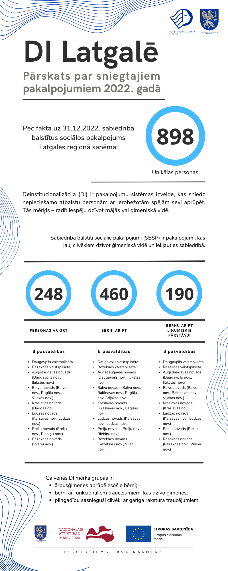 Arī 2022. gadā Latgalē turpinājās projekta “Deinstitucionalizācijas pasākumu īstenošana Latgales reģionā (DI Latgalē)” (Nr.9.2.2.1./15/I/005) realizācija. Kopā ar sadarbības partneriem no Latgales pašvaldībām tiek veidots pamats iekļaujošai sabiedrībai, kur bērni, kas šobrīd dzīvo sociālās aprūpes iestādēs, varēs augt ģimeniskā vidē un bērni ar funkcionāliem traucējumiem (FT), kas dzīvo ģimenēs, varēs saņemt sociālās rehabilitācijas pakalpojumus savās pašvaldībās. Savukārt pieaugušie ar garīga rakstura traucējumiem (GRT), atbilstoši savām iespējām, un ar speciālistu atbalstu, varēs izvēlēties dzīvot patstāvīgi un veiksmīgi iekļauties sabiedrībā.