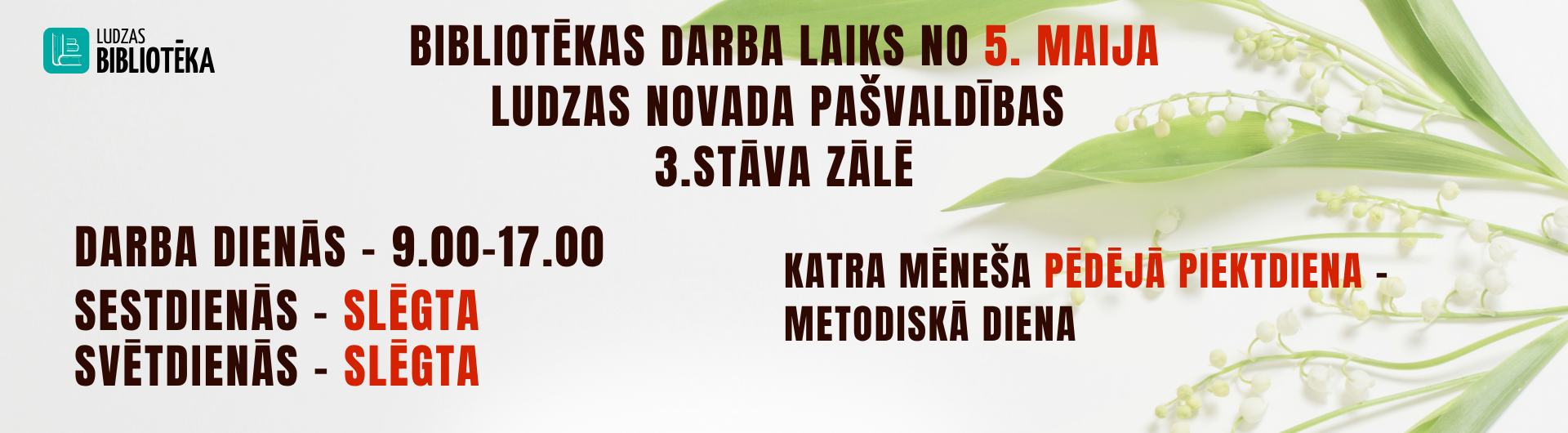 Informējam, ka sakarā ar remontdarbiem no 05.05.2026. bibliotēka uz laiku atradīsies jaunās telpās: Ludzā, Raiņa ielā 16 (Ludzas novada pašvaldības 3. stāva zālē).