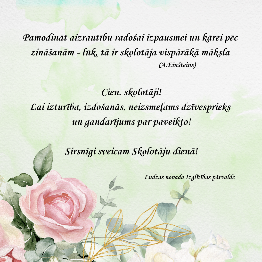 Sveicam svētkos un pateicamies Jums par ieguldīto darbu, zināšanām un sirds siltumu, ko sniedzat mūsu bērniem un jauniešiem. Jūs esat tie, kas ar pacietību un iedvesmu palīdz augt un attīstīties nākamajām paaudzēm.