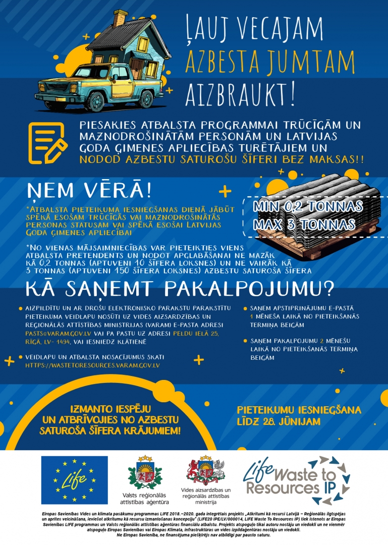 Vides aizsardzības un reģionālās attīstības ministrija (VARAM) informē, ka kampaņas “Ļauj vecajam azbesta jumtam aizbraukt!” ietvaros no š.g. 3. jūnija sākas azbestu saturošā šīfera krājumu nodošanas apglabāšanai atbalsta programmas 2. kārta, kuras ietvaros iespēja nodot azbestu saturošo šīferi ir ne tikai trūcīgām un maznodrošinātām personām, bet arī Latvijas Goda ģimenes apliecības “Goda ģimene” turētājiem.