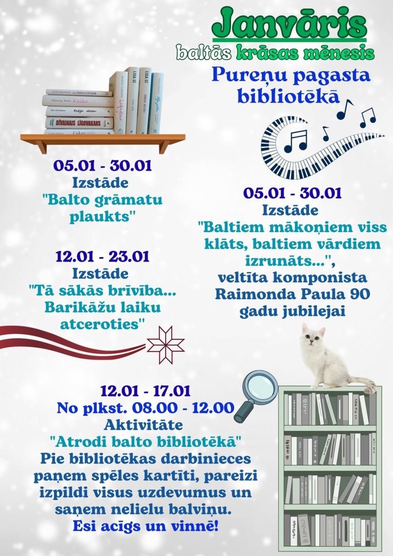 No 12. līdz 17. janvārim no plkst. 08.00 līdz 12.00 Pureņu pagasta bibliotēkā norisināsies aktivitāte "Atrodi balto bibliotēkā". Pie bibliotēkas darbinieces paņem spēles kartīti, pareizi izpildi visus uzdevumus un saņem nelielu balviņu. Esi acīgs un vinnē!