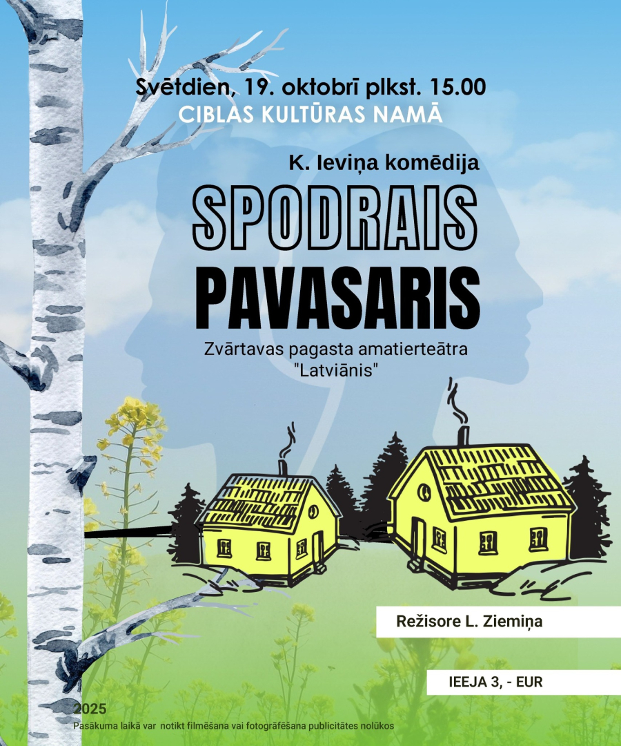 - 19.10. plkst. 15.00 Ciblas KN – Valkas novada Zvārtavas pagasta amatierteātra “Latviānis” viesizrāde: K. Ieviņa komēdija “Spodrais pavasaris”