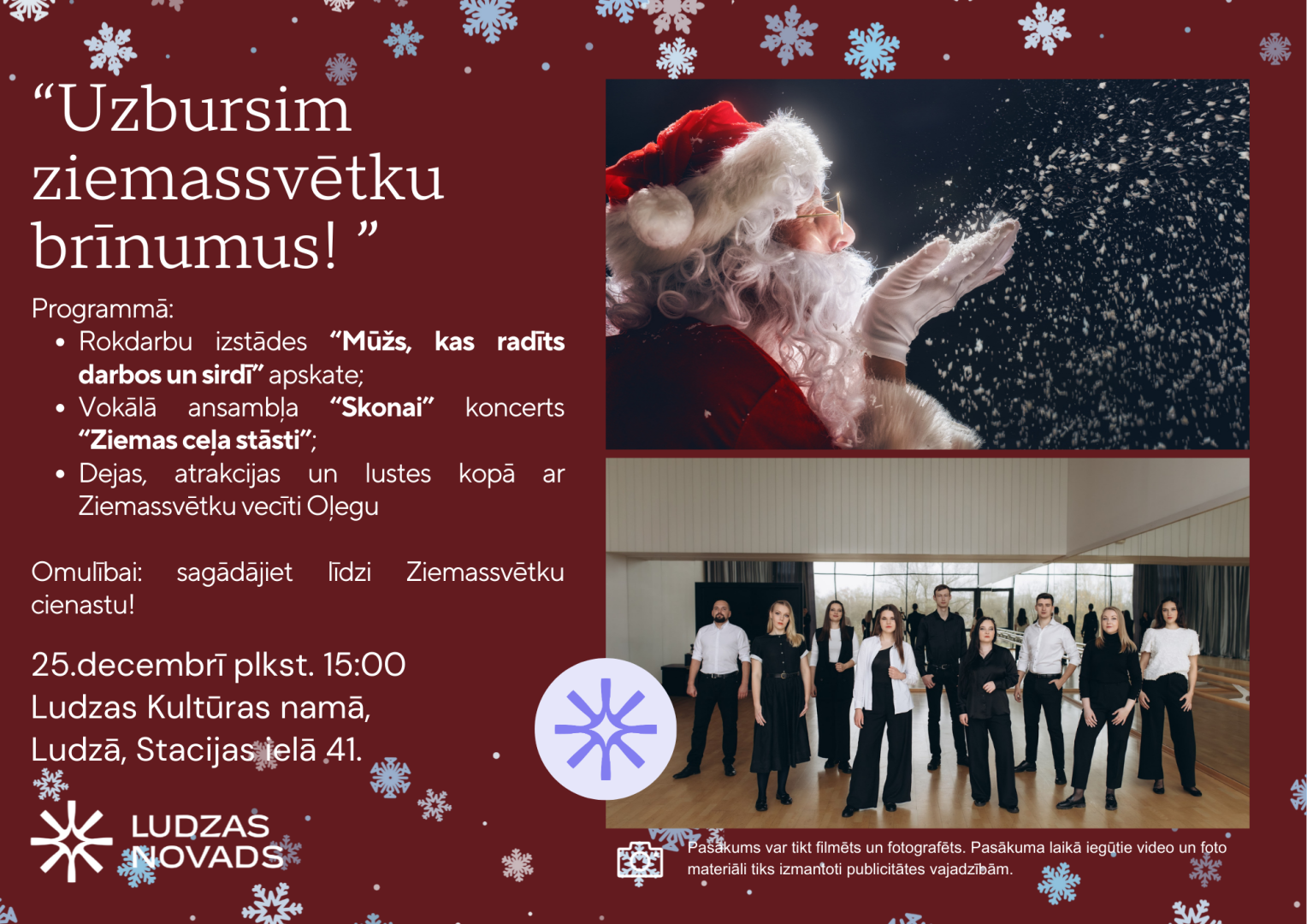 25.12. plkst. 15.00 Ludzas KN – ansambļa “SKONAI” koncerts “Ziemas ceļa stāsti”. Turpinājumā groziņballe visu paaudžu interesantiem, kopā ar Ziemassvētku vecīti Oļegu.
