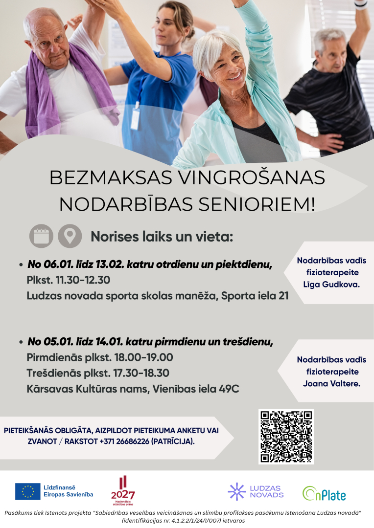 No 6. janvāra līdz 13. februārim, katru otrdienu un piektdienu no plkst. 11.30 līdz 12.30 projekta ietvaros tiek organizētas bezmaksas vingrošanas nodarbības senioriem, kas notiks Ludzas novada Sporta skolas manēžā (Sporta iela 21, Ludza).