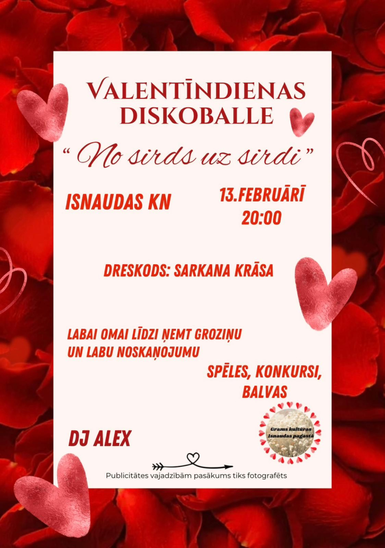 13.02. plkst. 20.00 Isnaudas KN - Diskolalle "No sirds uz sirdi" kopā ar DJ ALEX. Ieeja bezmaksas.