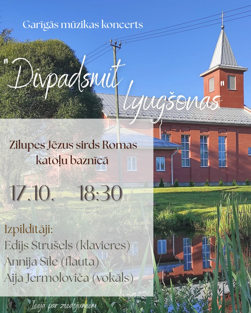 17. oktobrī plkst. 18.30 Zilupes Jēzus Sirds Romas katoļu baznīcā notiks garīgās mūzikas koncerts “Divpadsmit lūgšanas”, kurā muzicēs Edijs Strušels (klavieres), Annija Sīle (flauta) un Aija Jermoloviča (vokāls). Ieeja par ziedojumiem.