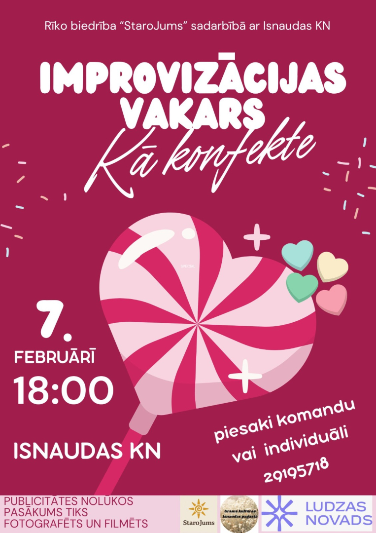 07.02. plkst.18.00 Isnaudas KN - improvizācija vakars "Kā konfekte". Iespējams pieteikt komandu vai piedalīties individuāli zvanot pa tālruni +371 29195718.