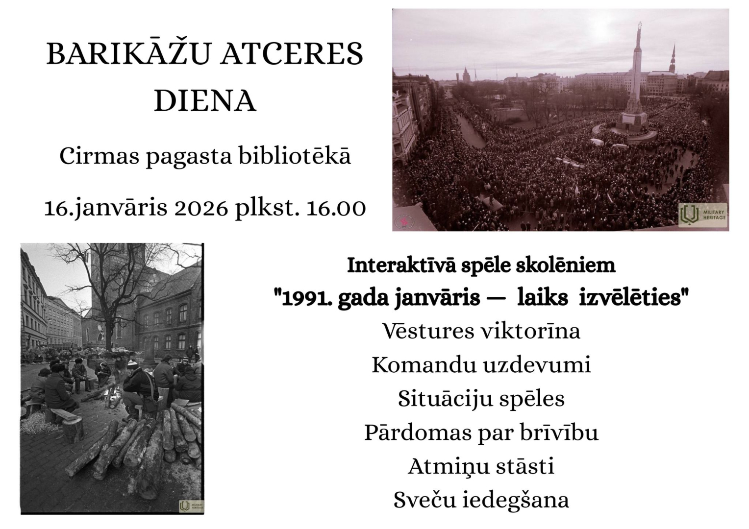 16. janvārī plkst. 16.00 Interaktīvā spēle skolēniem "1991. gada janvāris - laiks izvēlēties" Cirmas pagasta bibliotēkā.