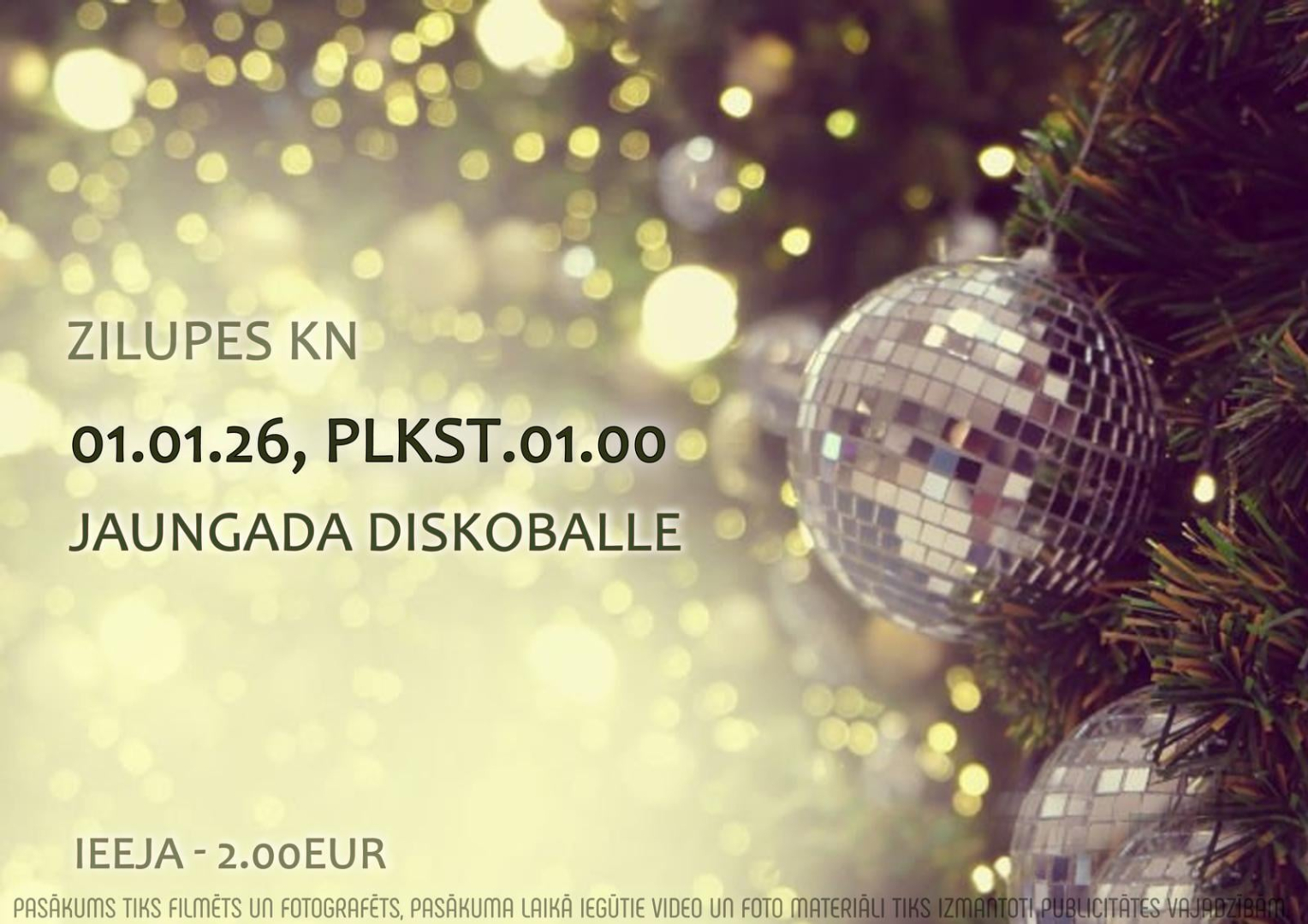 01.01.2026. plkst. 01.00 Zilupes KN – Jaungada diskoballe. Ieeja - 2,00 EUR.