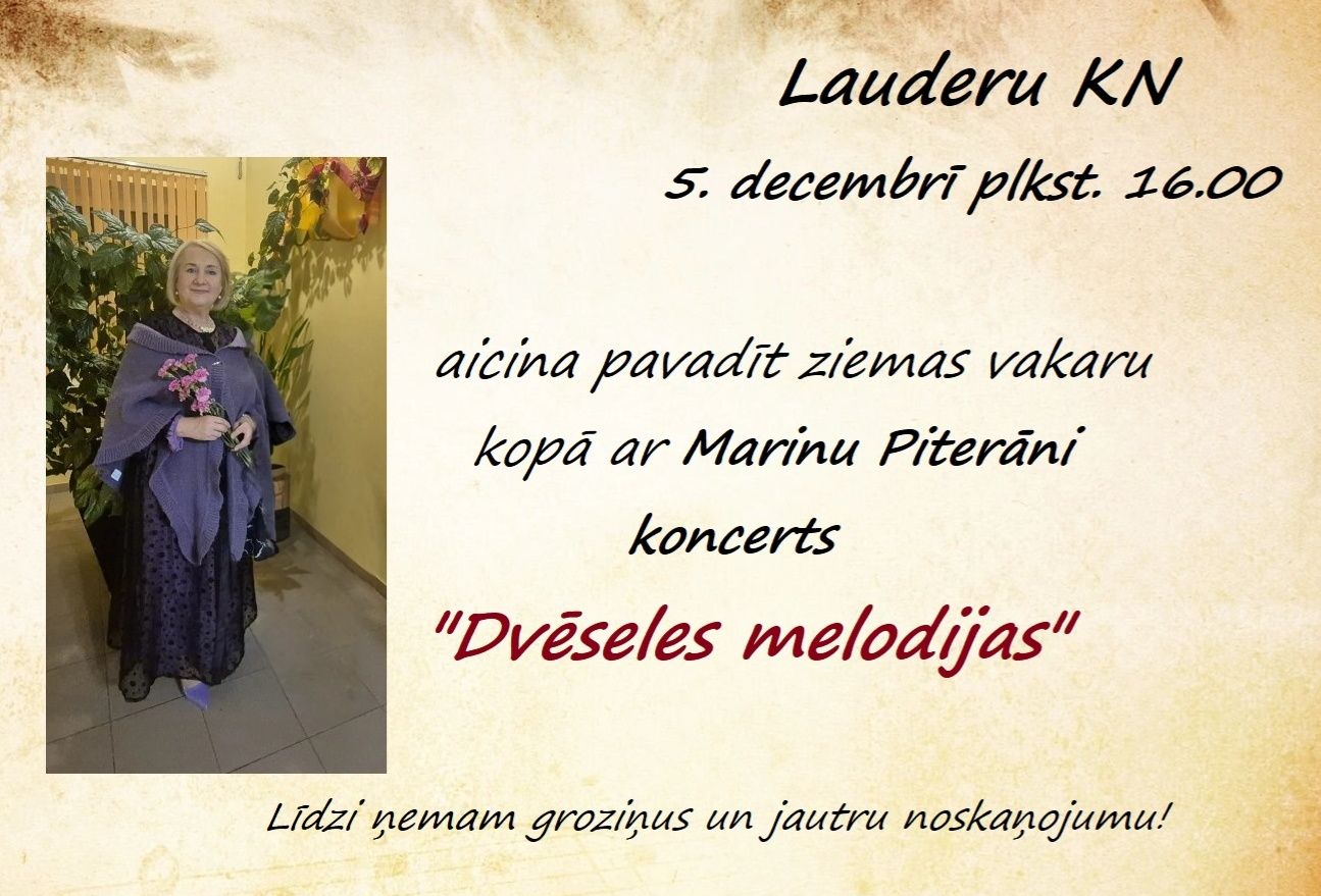 • 05.12. plkst.16.00 Lauderu KN aicina pavadīt ziemas vakara kopā ar Marinu Piterāni koncertā “Dvēseles melodijas”. Līdzi ņemam groziņus un jautru noskaņojumu.