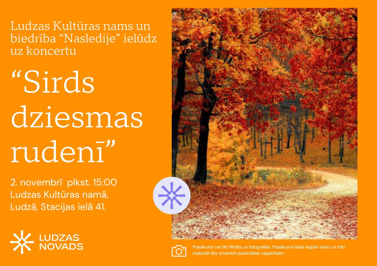 - 02.11. plkst. 15.00 Ludzas Kultūras nams un biedrība “Nasledije” aicina uz sirsnīgu koncertu “Sirds dziesmas rudenī”. Dziesmas, kas sasildīs sirdi un ienesīs gaišu noskaņu rudens pēcpusdienā. Nāc un izbaudi kopā būšanas prieku, skaistu mūziku un siltu atmosfēru!