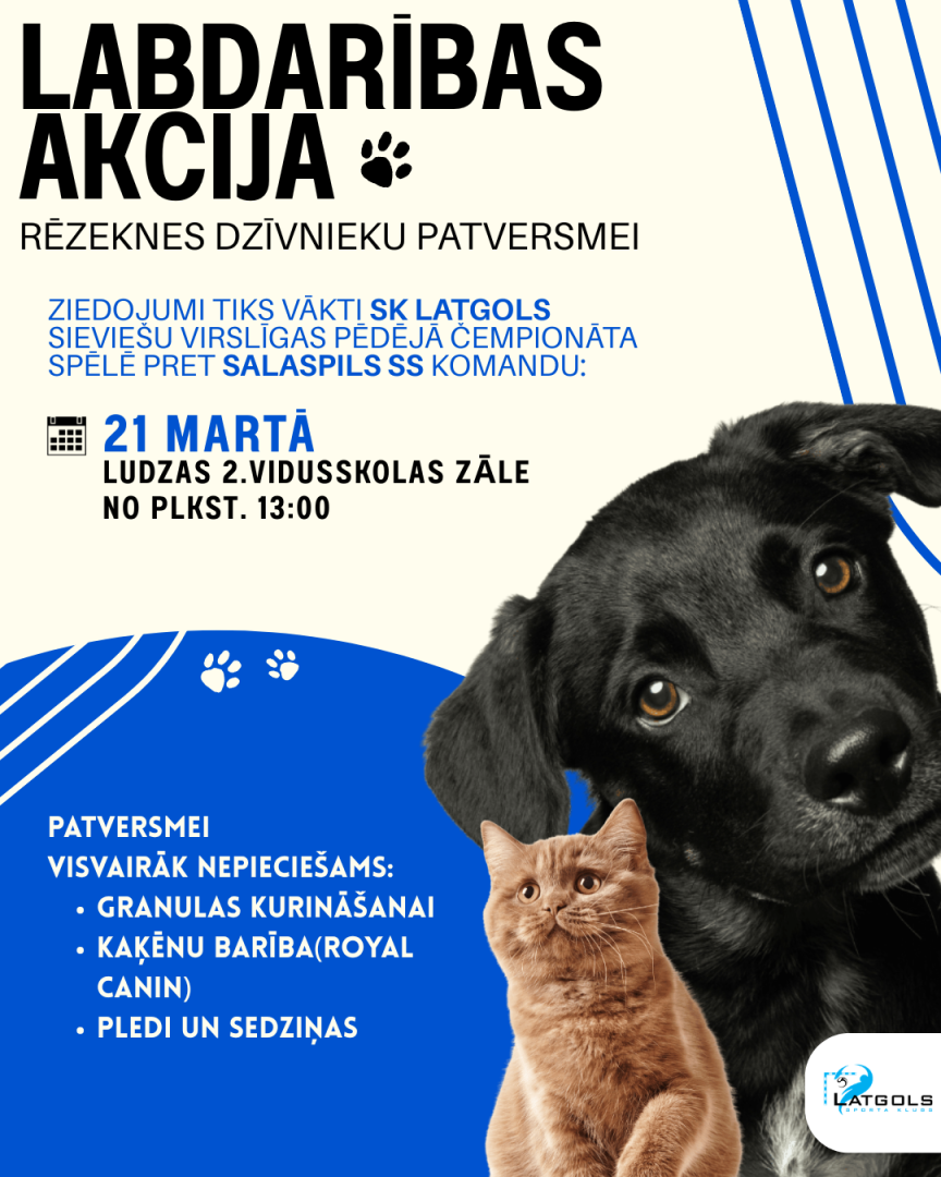 Spēles laikā SK Latgols aicina atbalstīt četrkājainos draugus un piedalīties labdarības akcijā, lai sniegtu palīdzību Rēzeknes dzīvnieku patversmei. Šobrīd patversmes iemītniekiem visvairāk nepieciešamas kurināmās granulas, kaķu barība, pledi un sedziņas.
