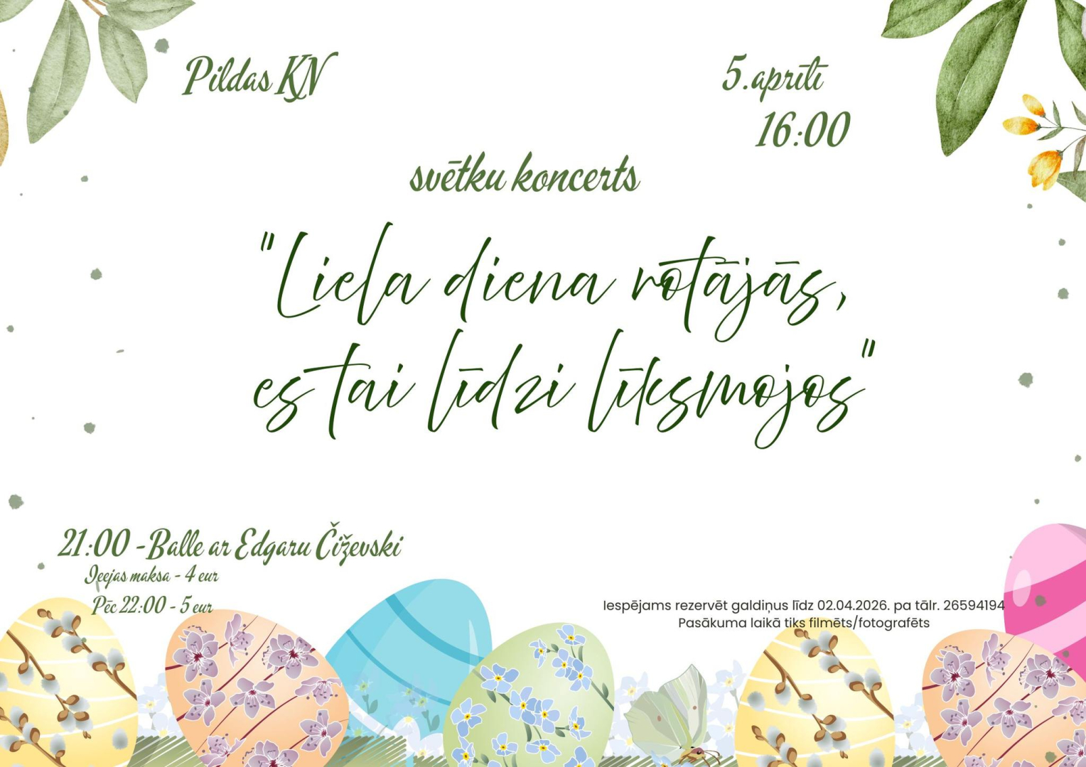 - 05.04. plkst. 16.00 Pildas KN - Lieldienu pasākums "Liela Diena rotājās, es tai līdzi līksmojos!".
