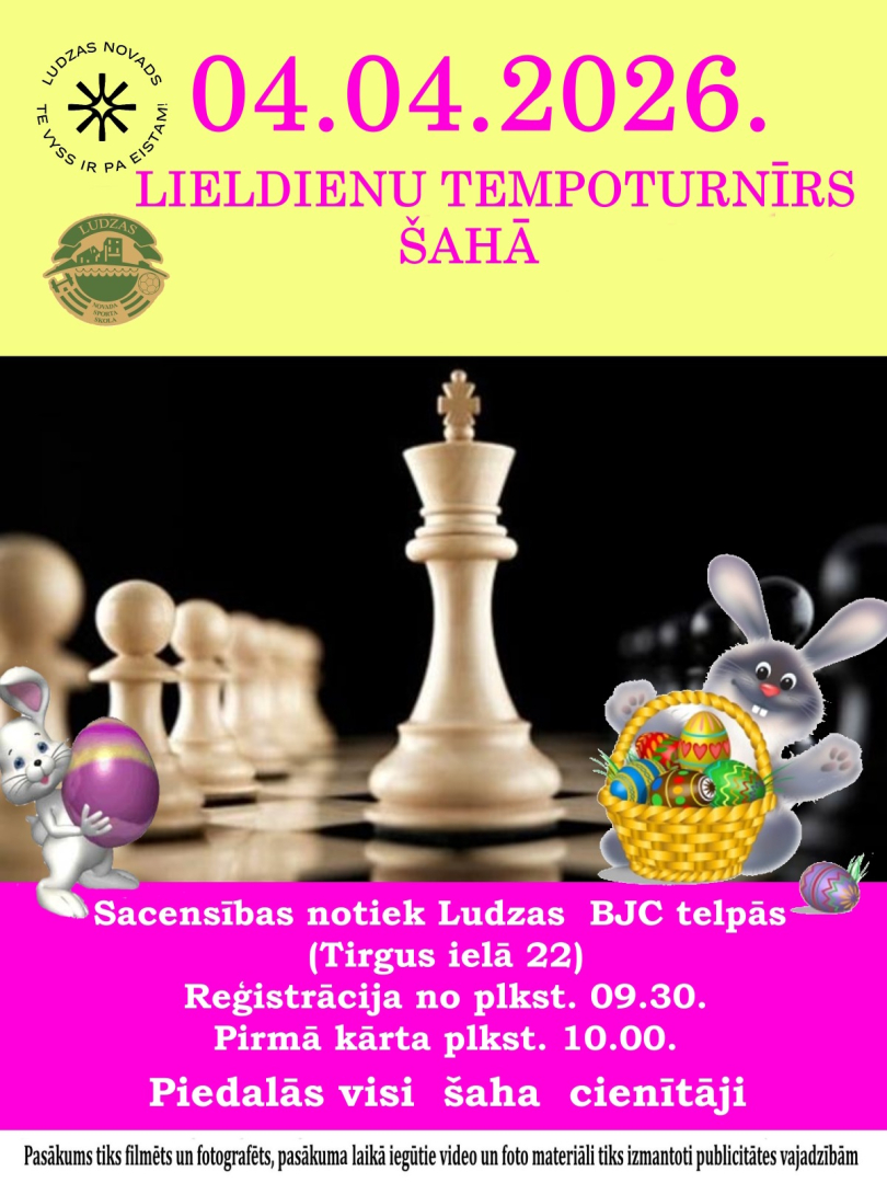 04.04. plkst. 10.00 Ludzas novada Bērnu un jauniešu centrā norisināsies Lieldienu tempoturnīrs šahā, ko organizē šaha klubs "Kaīsa" un Ludzas novada pašvaldība.