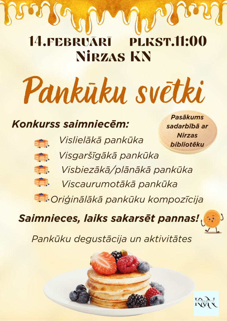 - 14.02. plkst. 11.00 Nirzas KN "Pankūku svētki". Sadarbībā ar Nirzas bibliotēku. Pankūku degustācija un aktivitātes. Konkurss saimniecēm.