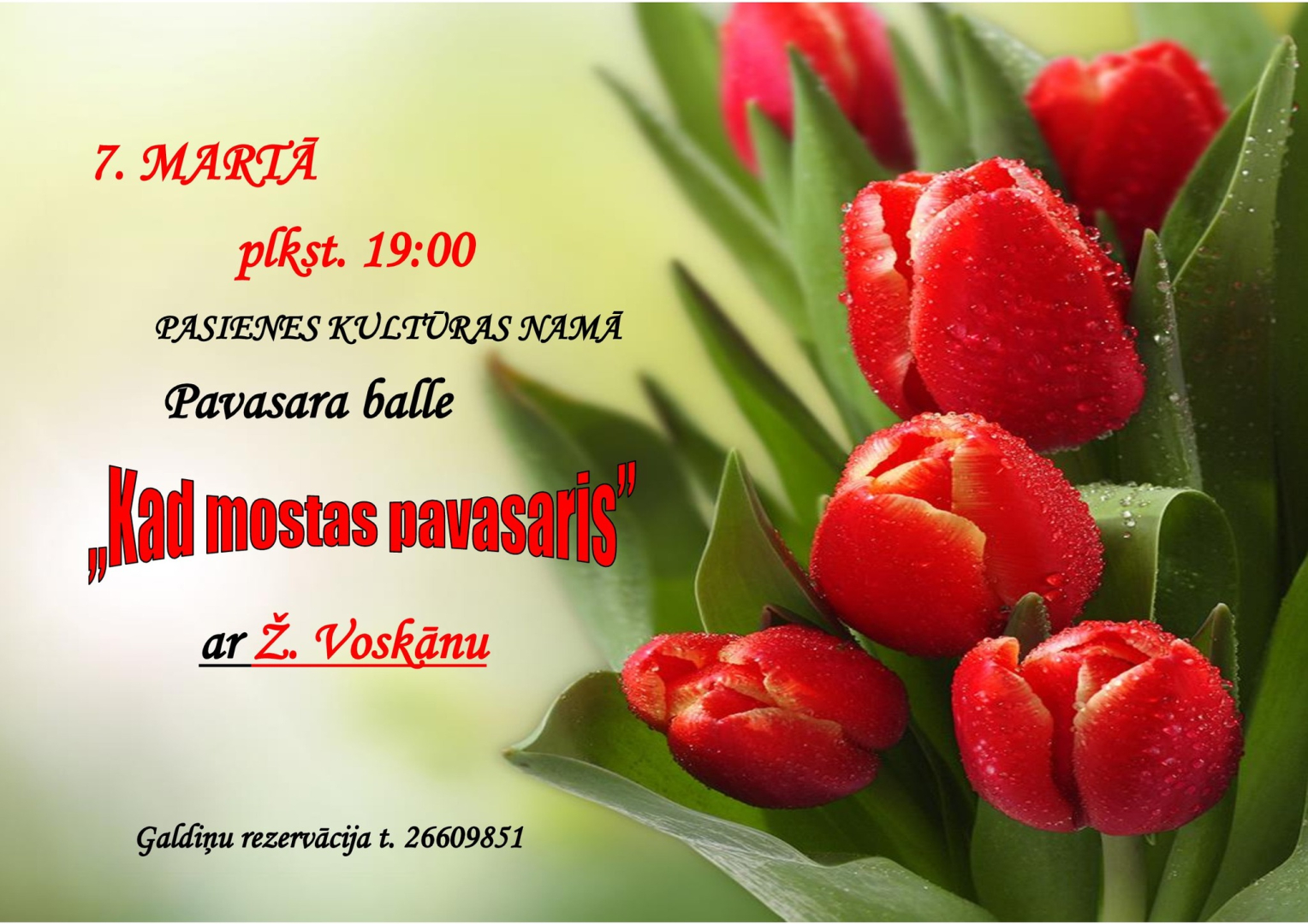 07.03. plkst. 19.00 Pasienes KN - Pavasara balle "Kad mostas pavasaris" ar Ž. Voskānu. Galdiņu rezervācija t. +371 26609851 līdz 4. martam.