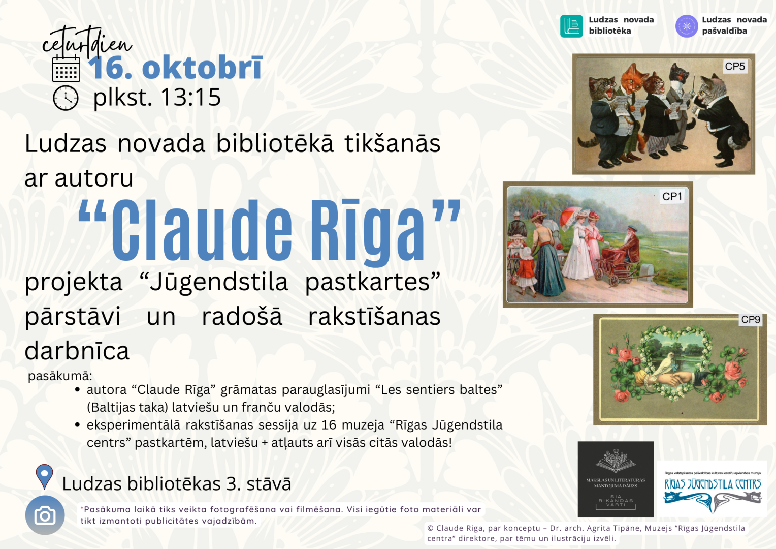 - 16.10. plkst. 13.15 Ludzas novada bibliotēka aicina ikvienu interesentu uz literāru notikumu — radošo rakstīšanas darbnīcu un tikšanos ar autoru "Claude Rīga". Tā būs lieliska iespēja: klausīties parauglasījumus franču un latviešu valodā, attīstīt savu rakstītprasmi, uzdot jautājumus un iesaistīties sarunā par literatūru, radošumu un rakstīšanas procesu.