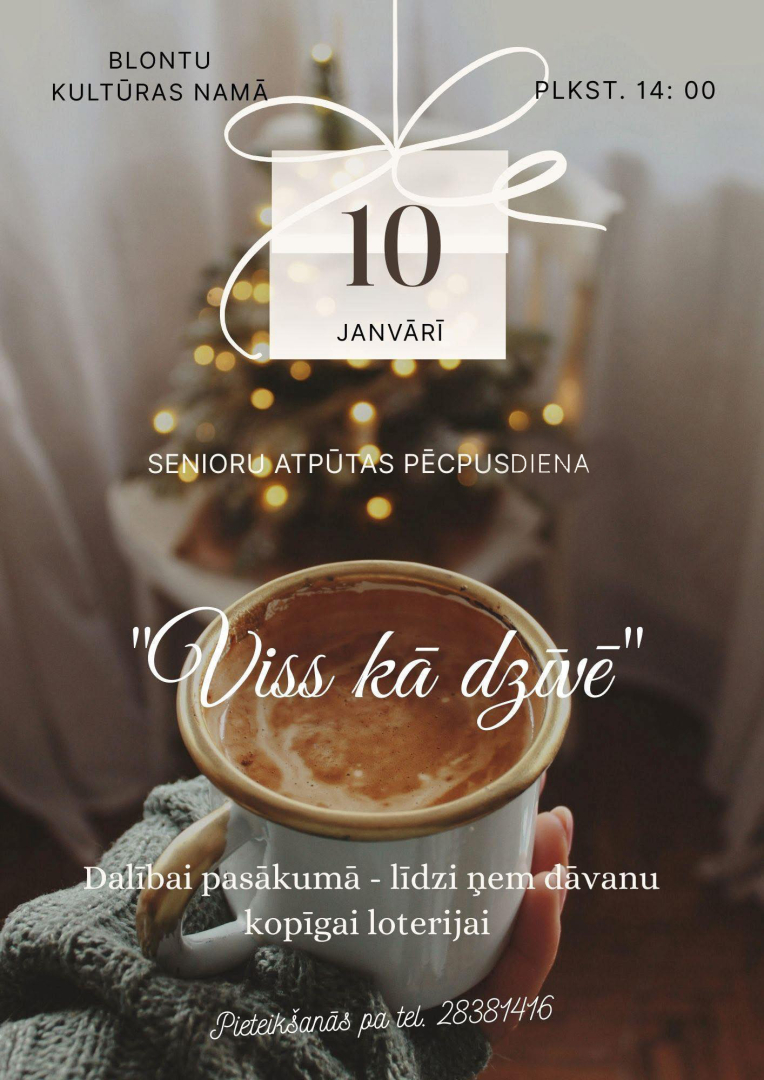 10.01. plkst. 14:00 Blontu KN - Senioru atpūtas pēcpusdiena "Viss kā dzīvē". Dalībai pasākumā - līdzi ņemt dāvanu kopīgai loterijai. Pieteikšanās zvanot uz t. +37128381416.