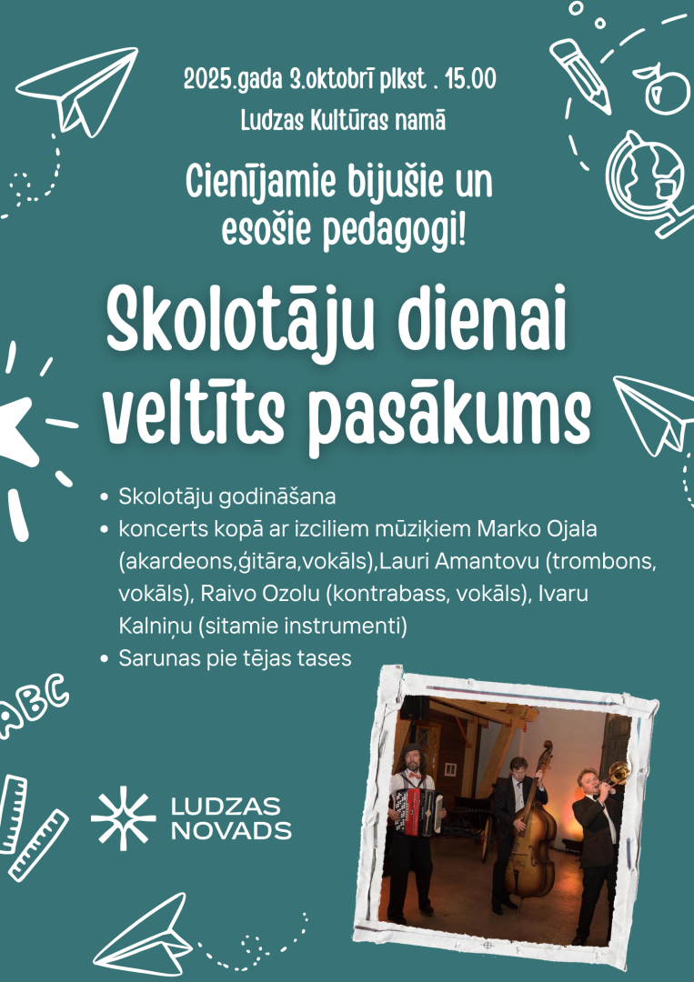 Ludzas novada Izglītības pārvalde sirsnīgi ielūdz esošos un bijušos skolotājus uz Skolotāju dienai veltītu pasākumu, kas notiks 2025. gada 3. oktobrī plkst.15.00 Ludzas Kultūras namā.
