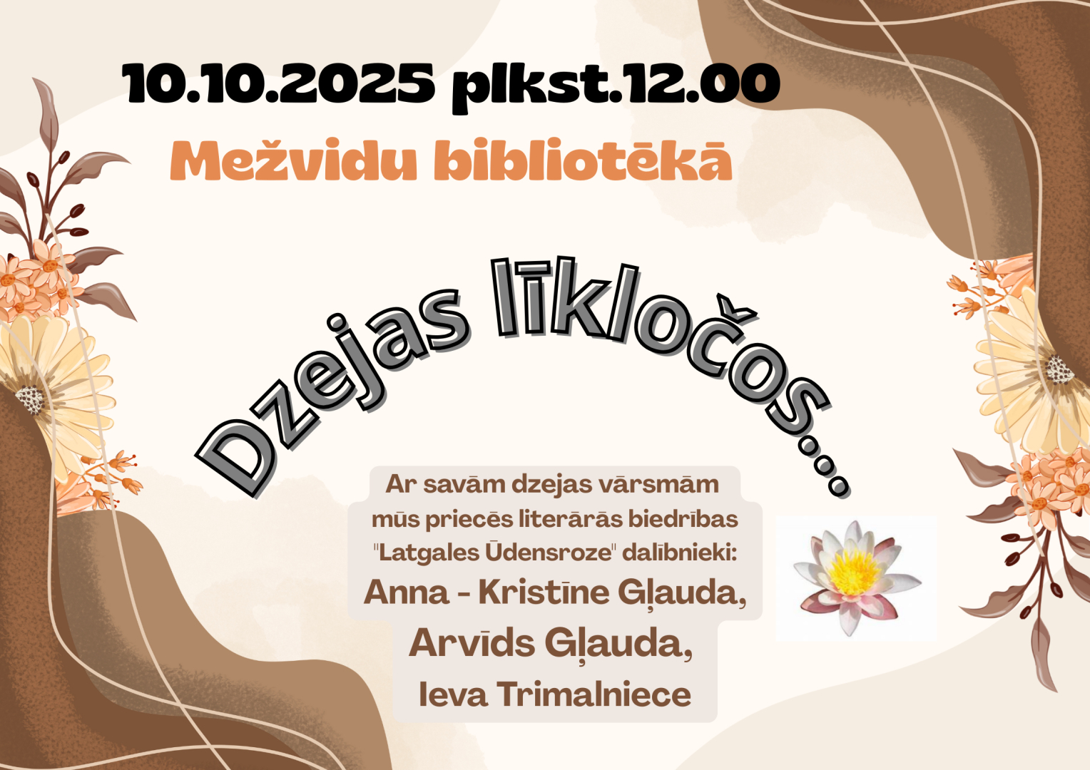 - 10.10. plkst. 12.00 Tikšanās ar dzejniekiem no literārās biedrības "Latgales Ūdensroze" Mežvidu pagasta bibliotēkā.