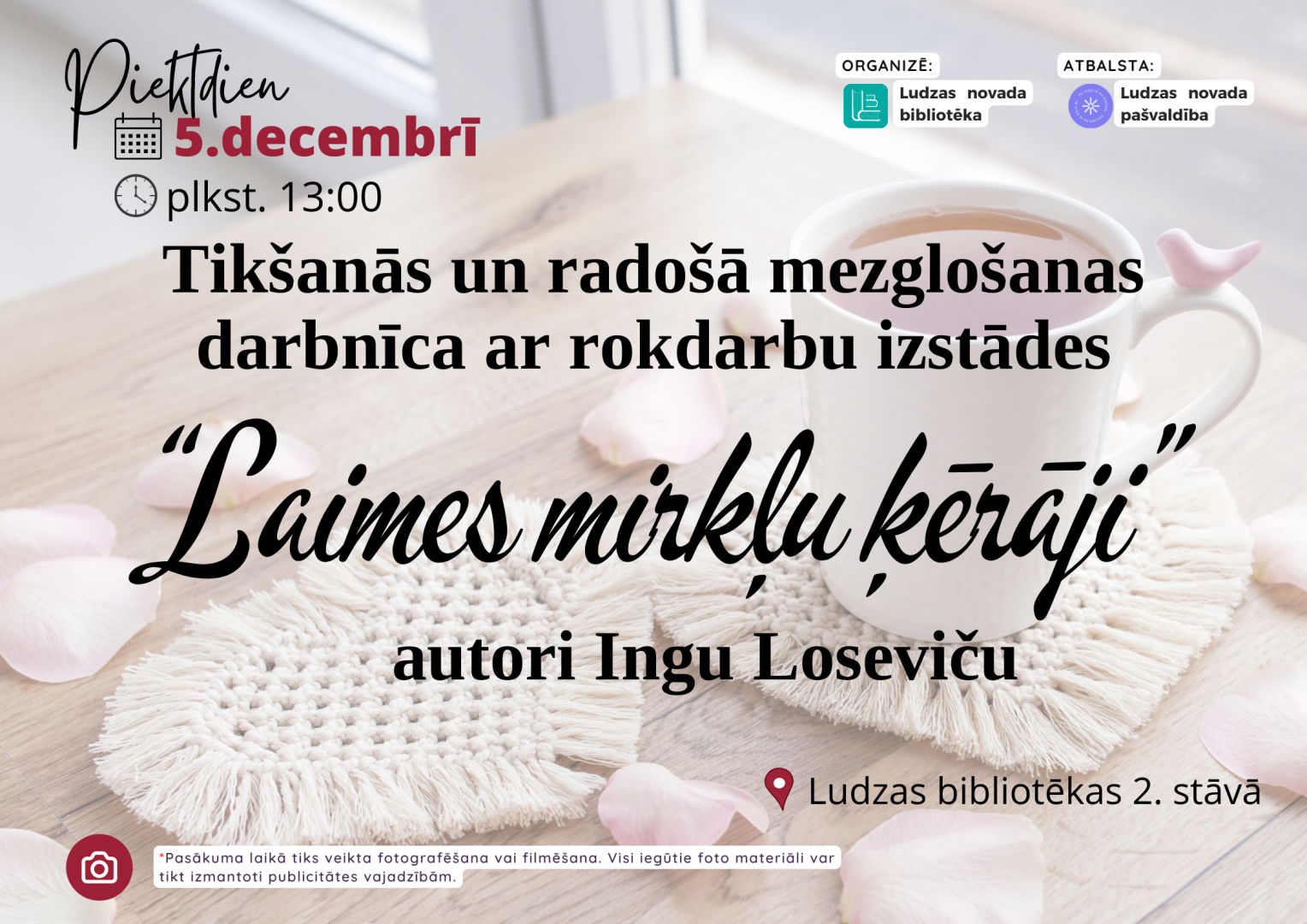 • 05.12. plkst. 13.00  Tikšanās un radošā mezglošanas darbnīca ar rokdarbu izstādes "Laimes mirkļu ķērāji” autori Ingu Loseviču Ludzas novada bibliotēkā.