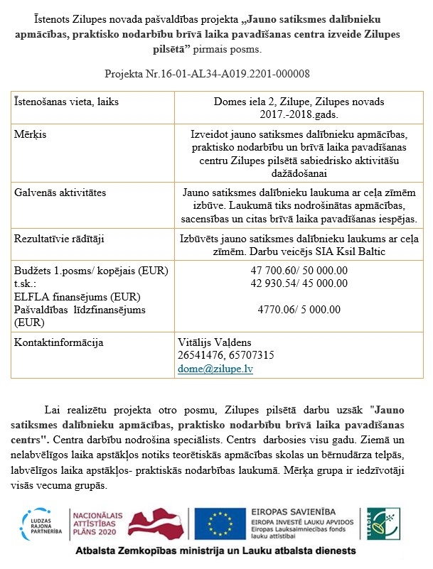 Projekta iesniedzējs, kontakti: Zilupes novada pašvaldība, Vitālijs Vaļdens,+371 26541476,+371 65707315, dome@zilupe.lv